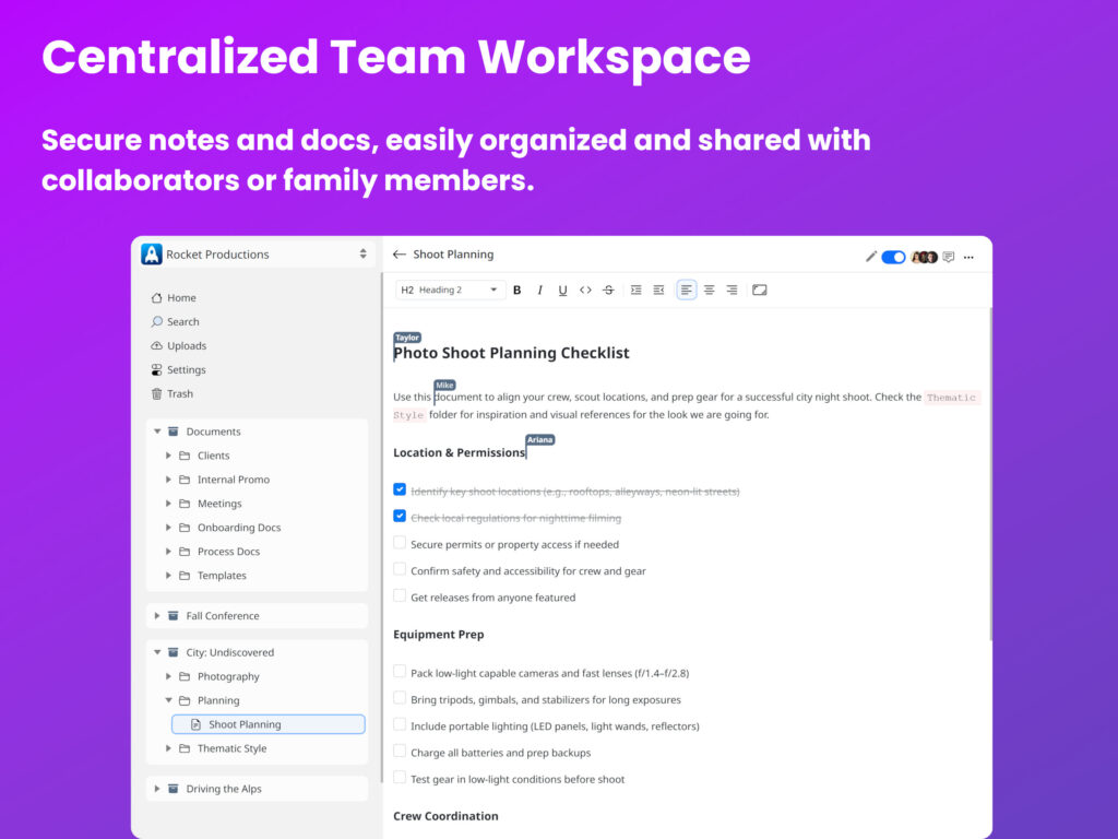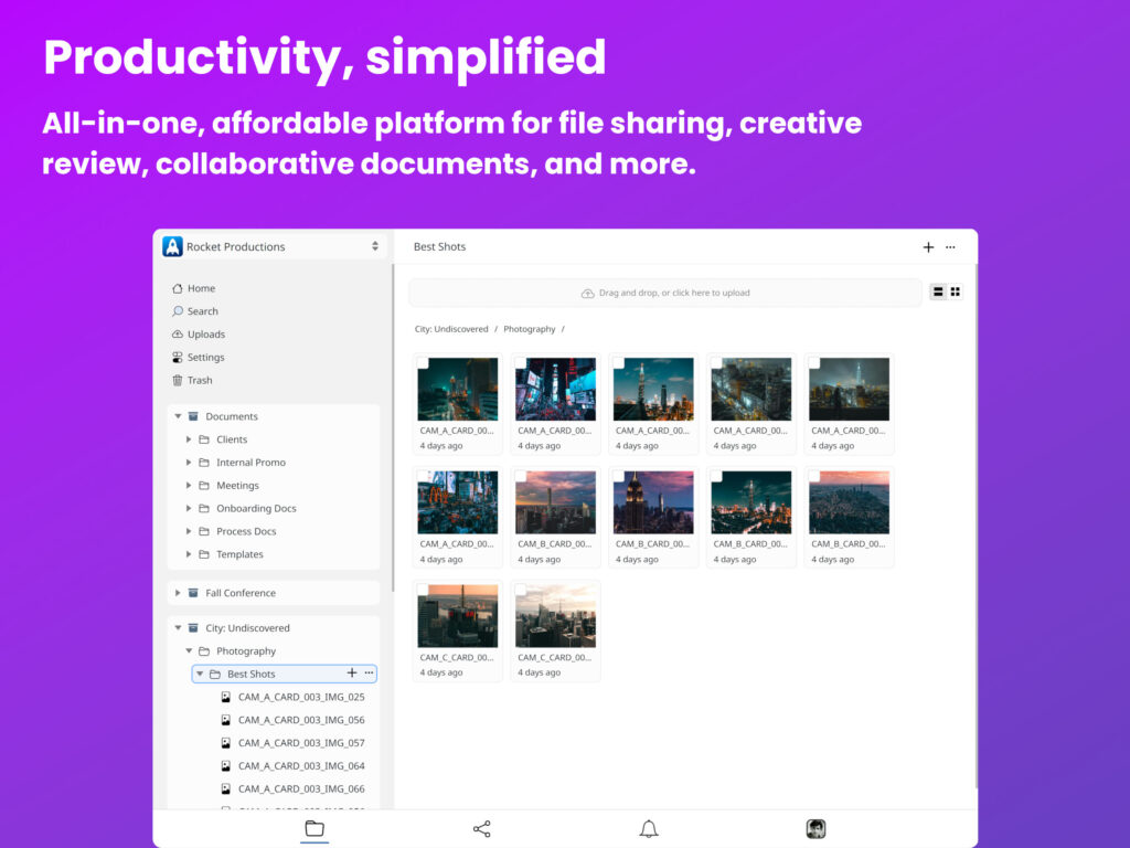 - Global, Secure File Sharing – Transfer files to clients or team members with role-based access and password protection.