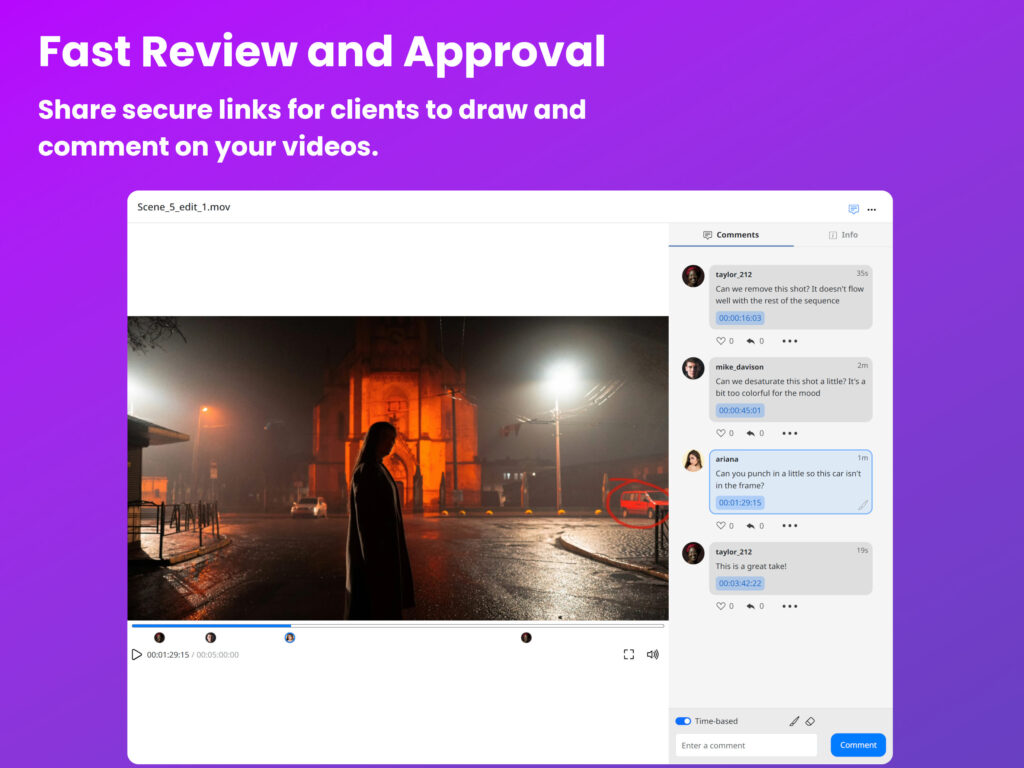 Fast, visual review and approval links allow sharing content securely with clients and teammates to get their feedback. Reviewers can draw and comment directly from their phones or desktop browsers.