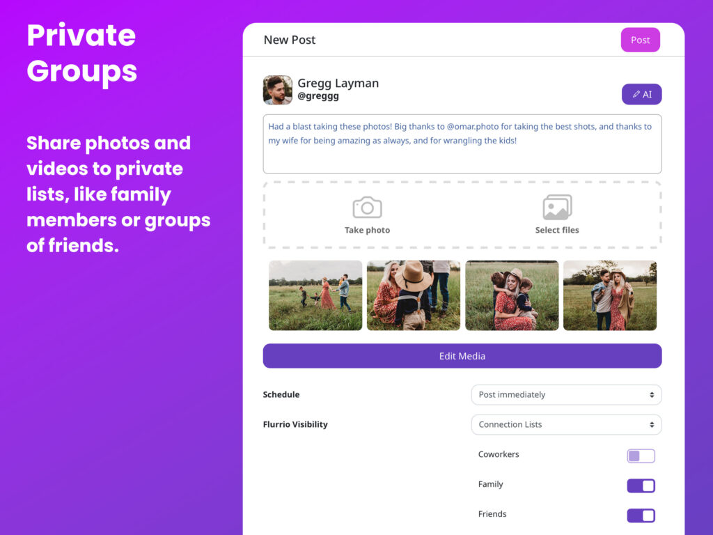 - Share images, video, and text privately with your connections, with a built-in private social network