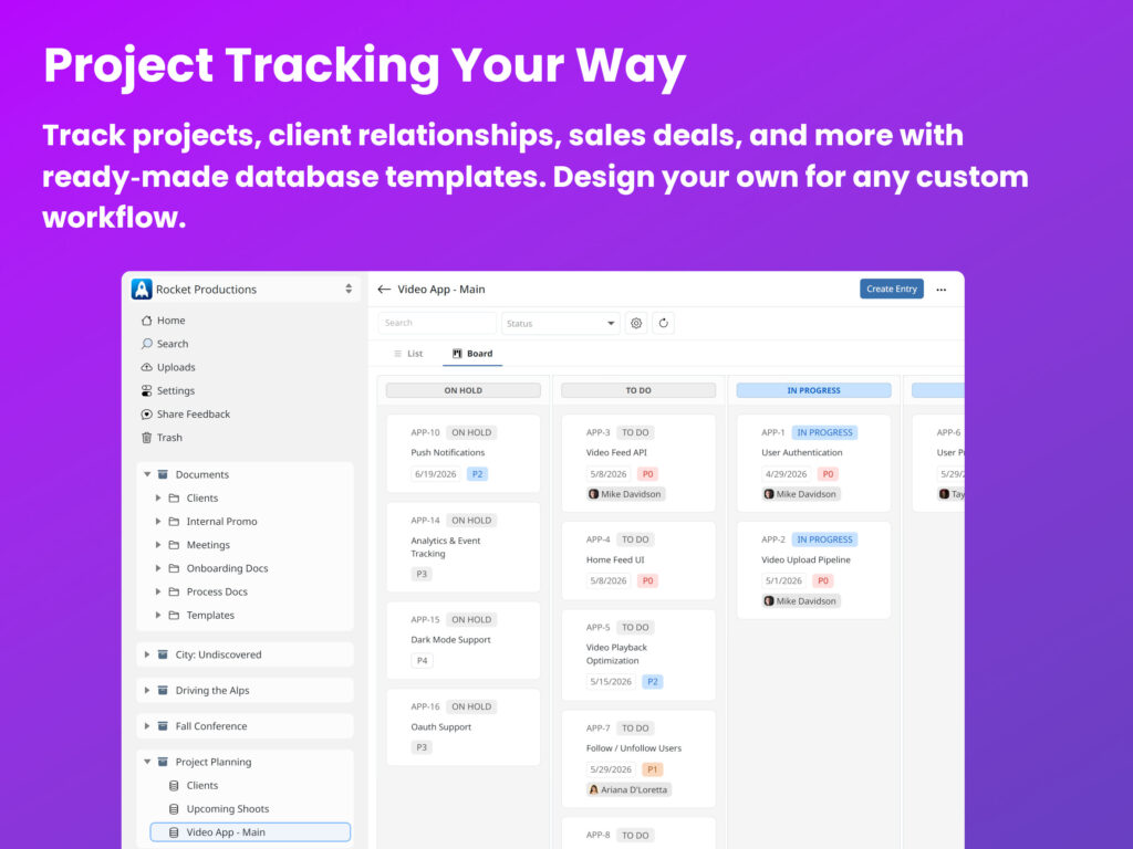 Built-in project tracking templates allow for tracking anything important, such as software development, video deliverables, client relationships, to do lists, or anything else. Use out of the box templates or build your own for ultimate flexibility.